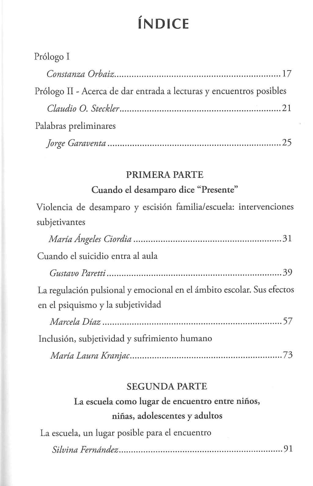 De esta manera, aquel pequeño maestro de once años, adelantó la esencia de este libro: pensar a la escuela como un lugar diferente, más allá de la mera transmisión de contenidos curriculares, de ocupar él un lugar pasivo junto a sus compañeros copiando consignas de un pizarrón, limitándose a hablar cuando el adulto a cargo del curso lo disponga. Por el contrario, de lo que se tratan las páginas que conforman este trabajo colectivo, interdisciplinario, es de un Encuentro… una propuesta a la lectura y al pensamiento, para construir juntos herramientas que permitan concebir a la escuela y las aulas como un escenario de Encuentro entre niños, niñas, adolescentes y adultos en el día a día del transcurrir escolar: Encuentro de miradas y entonamientos que desalojen a los niños, niñas y adolescentes de etiquetas psicopatológicas que hacen cuerpo en sus cuerpos y psiquismos, borrando cualquier trazo de singularidad: Encuentro a hacer de la diferencia una cualidad dentro del aula; Encuentro también a una nueva escritura del papel de la escuela hoy, lugar de sostén en el proceso de constitución subjetiva de niños, niñas y adolescentes.