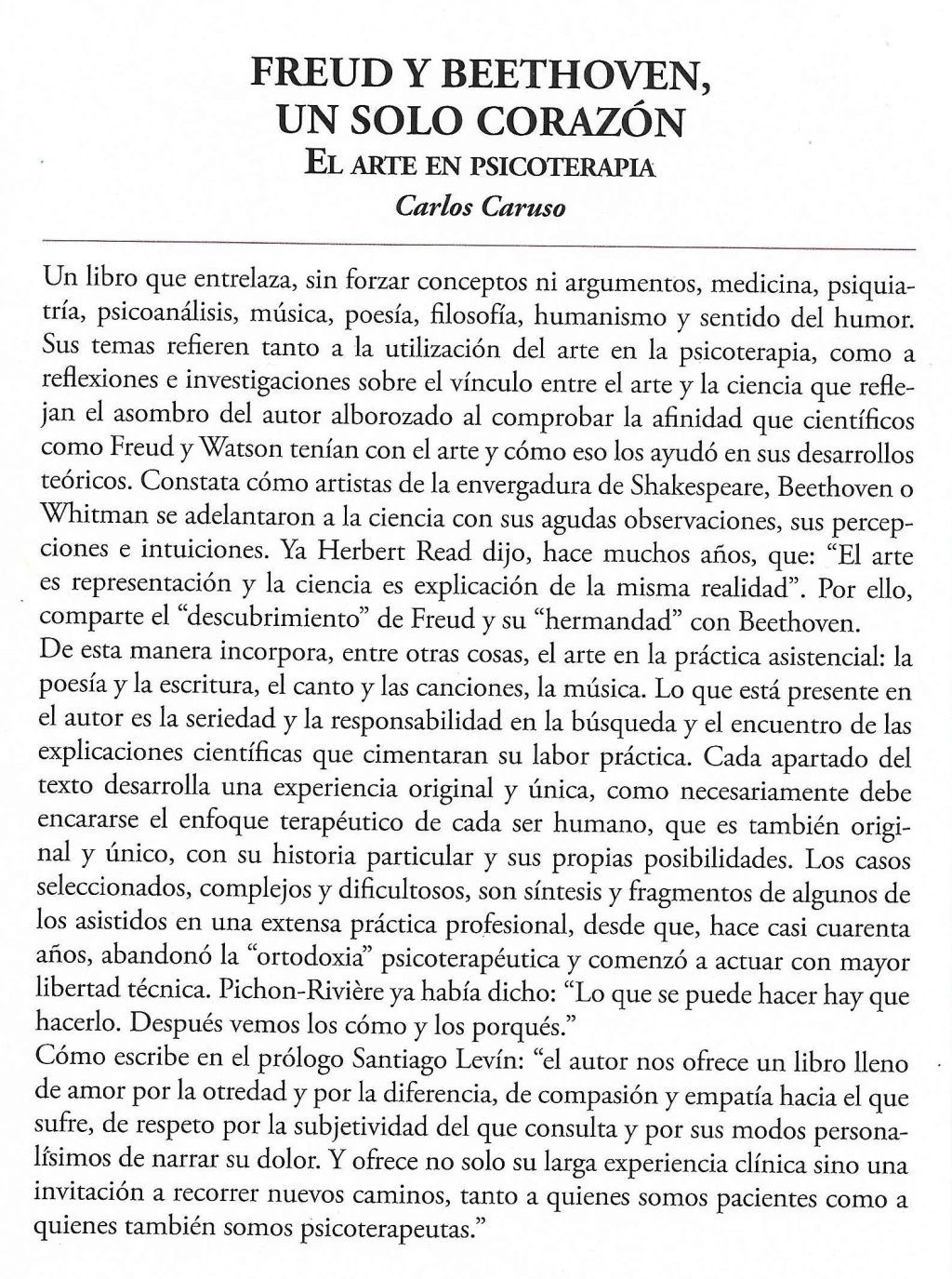 Un libro que entrelaza, sin forzar conceptos ni argumentos, medicina, psiquiatría, psicoanálisis, música, poesía, filosofía, humanismo y sentido del humor. Sus temas refieren tanto a la utilización del arte en la psicoterapia, como a reflexiones e investigaciones sobre el vínculo entre el arte y la ciencia que reflejan el asombro del autor alborozado al comprobar la afinidad que científicos como Freud y Watson tenían con el arte y cómo eso los ayudó en sus desarrollos teóricos. Constata cómo artistas de la envergadura de Shakespeare, Beethoven o Whitman se adelantaron a la ciencia con sus agudas observaciones, sus percepciones e intuiciones. Ya Herbert Read dijo, hace muchos años, que: “El arte es representación y la ciencia es explicación de la misma realidad”. Por ello, comparte el “descubrimiento” de Freud y su “hermandad” con Beethoven.
