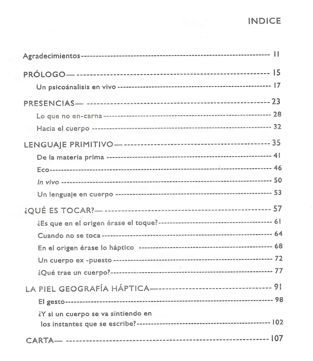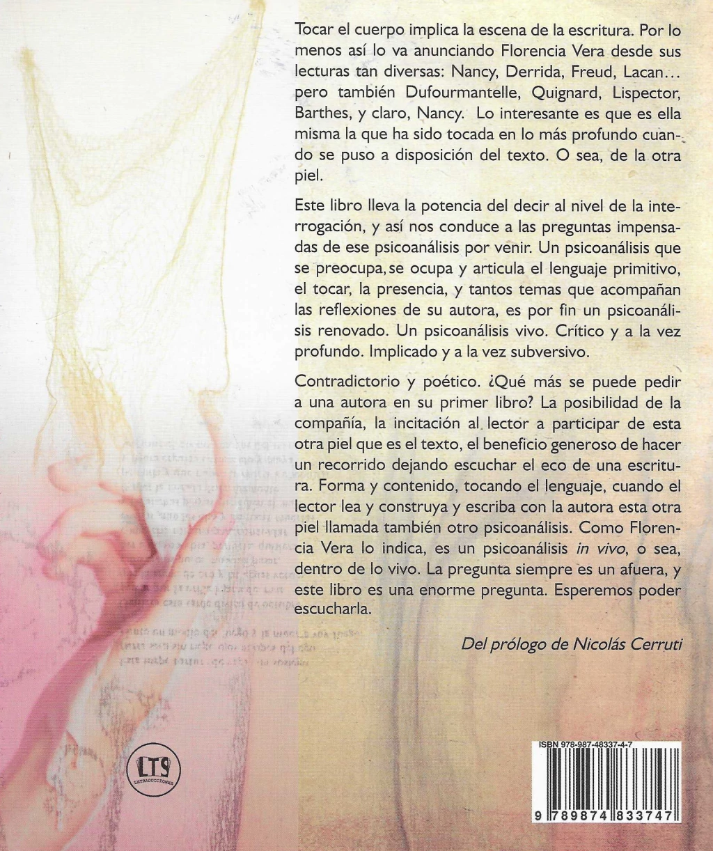 Tocar el cuerpo implica la escena de la escritura. Por lo menos asi lo va enunciando la autora desde sus lecturas tan diversas: Nancy, Derrida, Freud, Lacan... pero tambien Dufourmantelle, Quignard, Lispector, Barthes, y claro, Nancy. Lo interesante es que ella es la que ha sido tocada en lo mas profundo cuando se puso a disposicion del texto. O sea, de la otra piel.