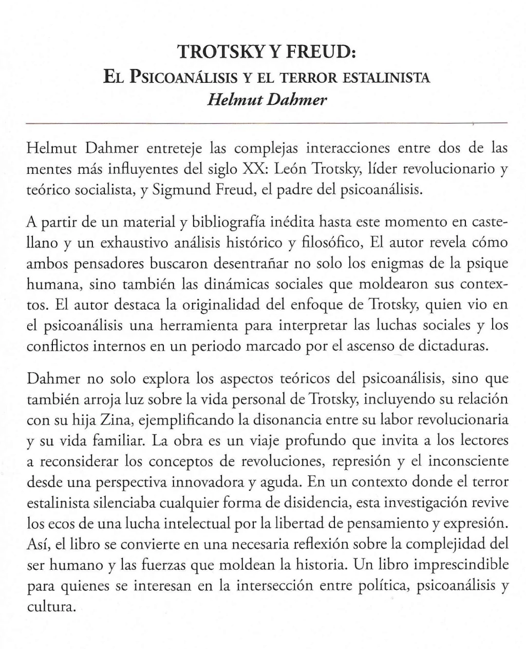 Helmut Dahmer entreteje las complejas interacciones entre dos de las mentes más influyentes del siglo XX: León Trotsky, líder revolucionario y teórico socialista, y Sigmund Freud, el padre del psicoanálisis. A partir de un material y bibliografía inédita hasta este momento en castellano y un exhaustivo análisis histórico y filosófico, El autor revela cómo ambos pensadores buscaron desentrañar no solo los enigmas de la psique humana, sino también las dinámicas sociales que moldearon sus contextos. El autor destaca la originalidad del enfoque de Trotsky, quien vio en el psicoanálisis una herramienta para interpretar las luchas sociales y los conflictos internos en un periodo marcado por el ascenso de dictaduras. Dahmer no solo explora los aspectos teóricos del psicoanálisis, sino que también arroja luz sobre la vida personal de Trotsky, incluyendo su relación con su hija Zina, ejemplificando la disonancia entre su labor revolucionaria y su vida familiar. La obra es un viaje profundo que invita a los lectores a reconsiderar los conceptos de revoluciones, represión y el inconsciente desde una perspectiva innovadora y aguda. En un contexto donde el terror estalinista silenciaba cualquier forma de disidencia, esta investigación revive los ecos de una lucha intelectual por la libertad de pensamiento y expresión. Así, el libro se convierte en una necesaria reflexión sobre la complejidad del ser humano y las fuerzas que moldean la historia. Un libro imprescindible para quienes se interesan en la intersección entre política, psicoanálisis y cultura.